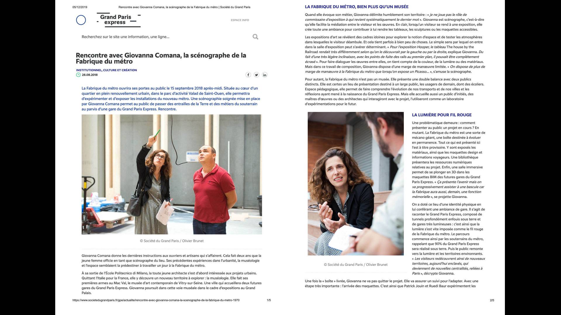 Margaux Steinmyller, Milk magazine — Moderne Maharajah, un mécène des années 30 — 2019 - Site de la Sociéte du Grand Paris — Rencontre avec Giovanna Comana, la scénographe de la Fabrique du métro — 2018